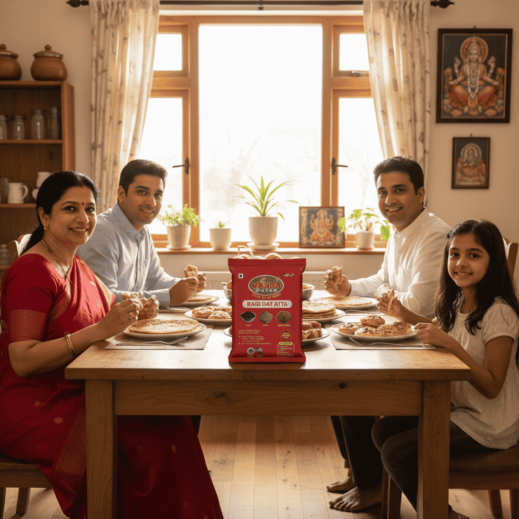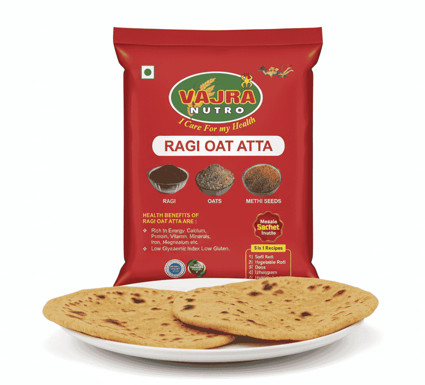 Fuel your day with VajraNutro Ragi Oat Atta, a wholesome combination of Ragi, Oats, and Methi Seeds. This high-fiber atta supports strong bones, balanced energy, and improved digestion.